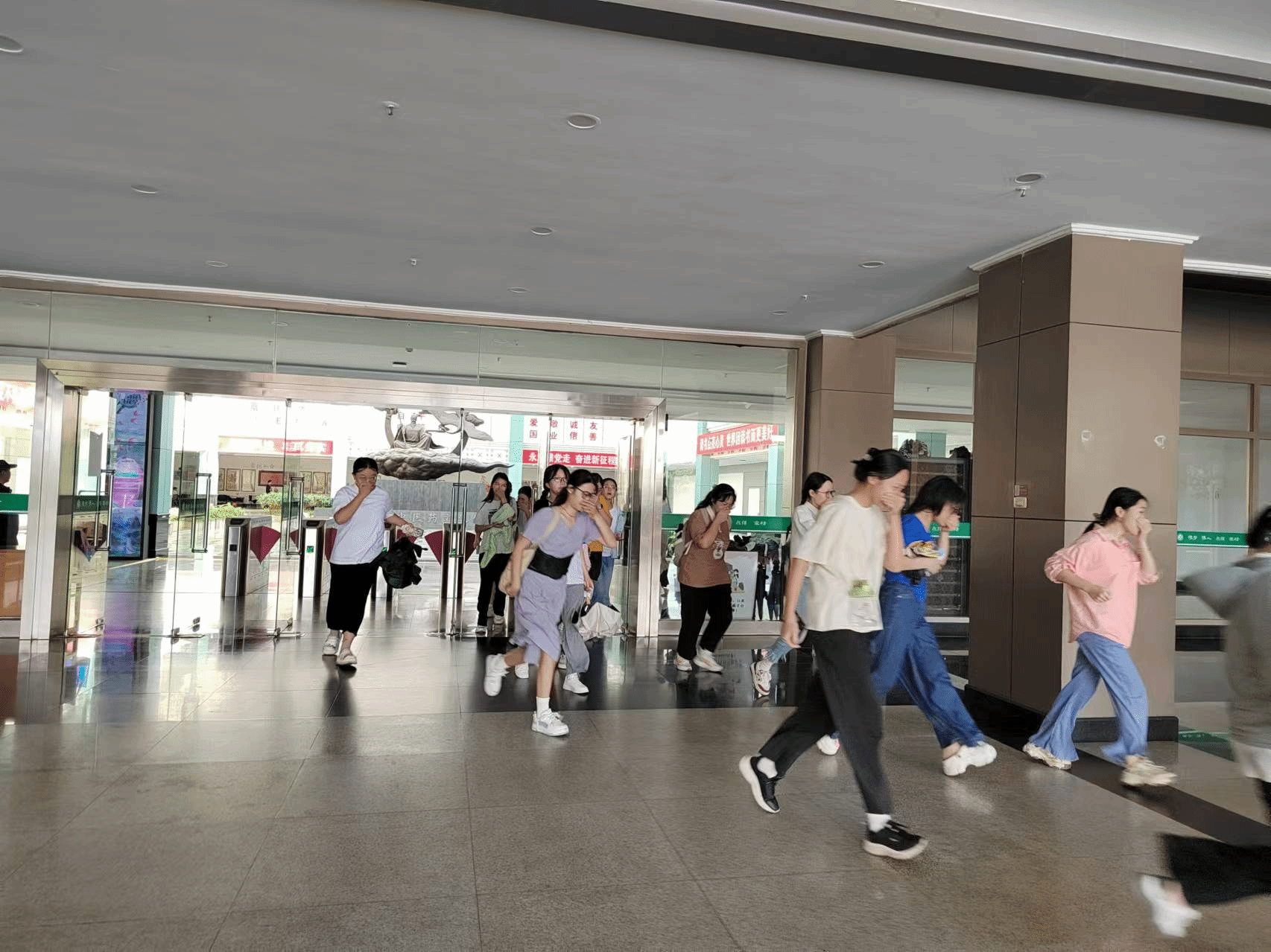本次演练模拟图书馆大楼发生重大火情,楼栋保安员发现险情后立即向校园110指挥中心报警,值班员接警后立刻上报火情,学校及时启动应急疏散预案,图书馆内广播马上响起疏散撤离通知,楼内师生在安全员的引导下,按照“弯腰、低头、捂口鼻、摸墙走”等火场逃生要领,沿疏散标识迅速转移至安全地带。校园119、校园120第一时间赴现场施救,各应急工作组也随即赶赴现场。